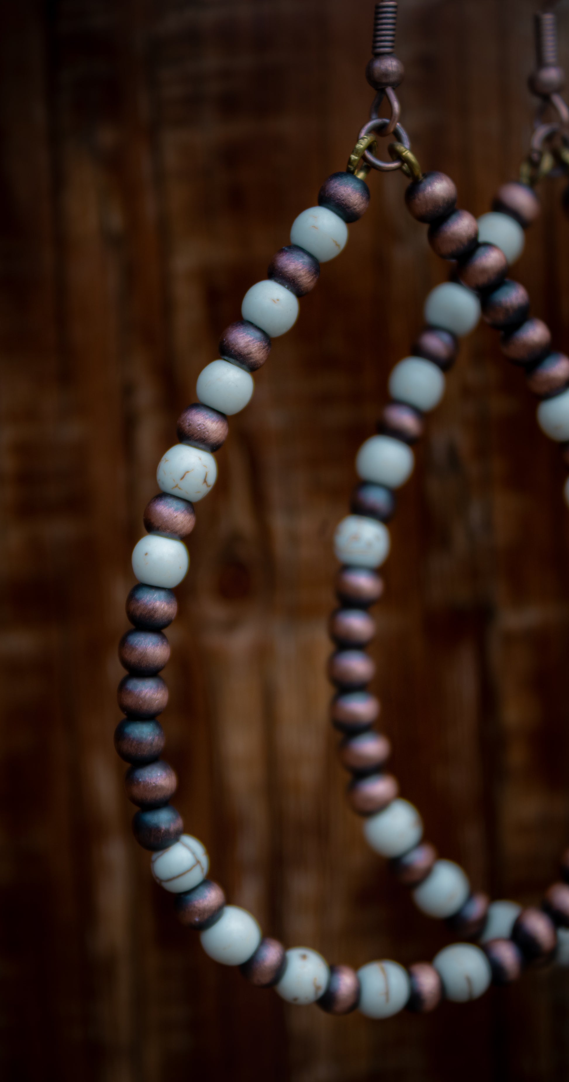 These elegant teardrop earrings feature a mix of copper Navajo-style pearls and soft white stone beads, creating the perfect blend of rustic charm and classic femininity. Lightweight, neutral, and effortlessly wearable, they add that subtle western touch to any outfit; from denim and dust to Sunday best.