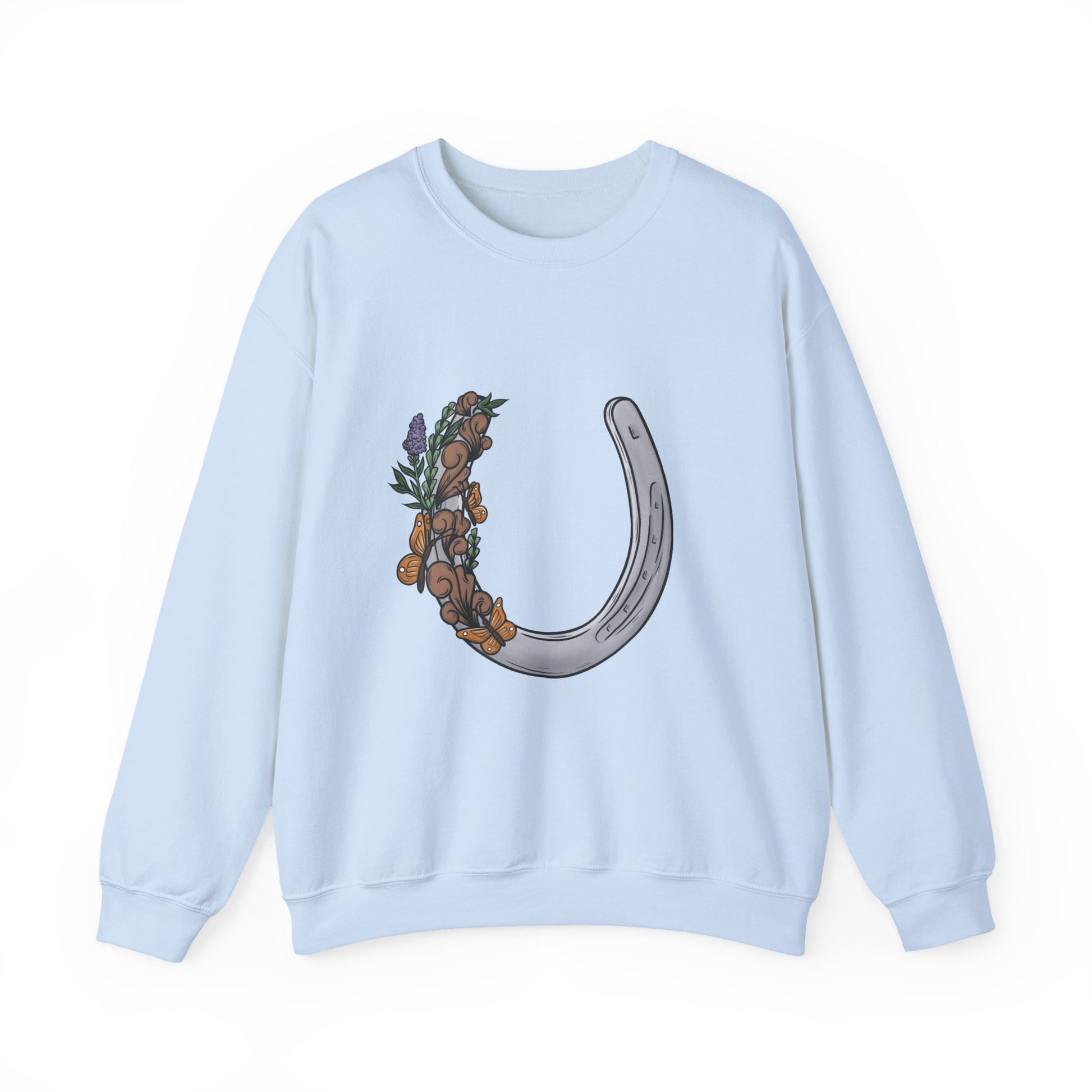 nspired by the quiet beauty of the West, the Prairie Blessings Crew blends protection, purpose, and the tender marks of creation into one timeless piece. A classic horseshoe—long believed to guard and guide—is wrapped in tooled florals and drifting monarchs, reminding us of God’s gentle hand in every season. For the cowgirl who finds her peace in open pastures and her strength in her faith, this crewneck carries meaning in every detail.