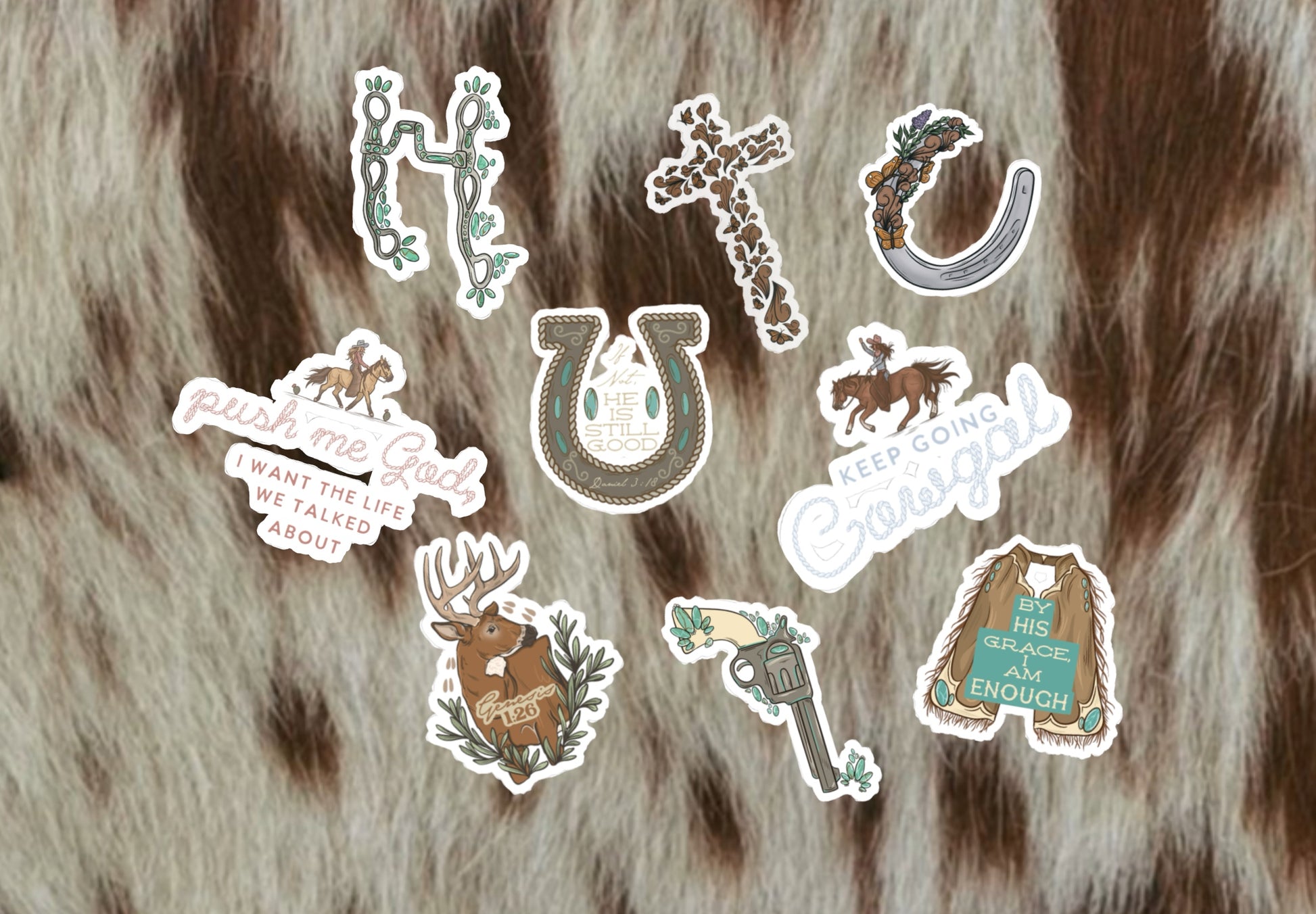 The Cowgal Faith Bundle includes three handpicked stickers from my faith-inspired designs — scripture touches, western florals, rope lettering, and encouraging cowgirl messages that lift your spirit and remind you Who goes before you.